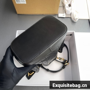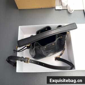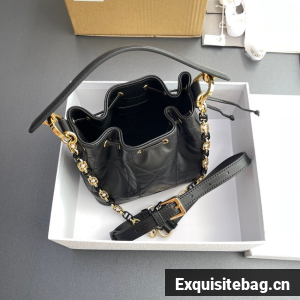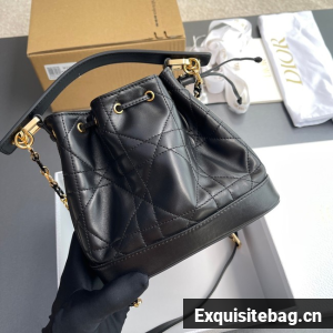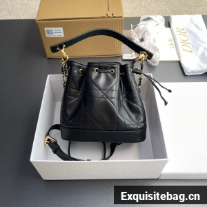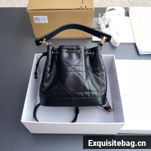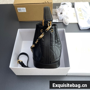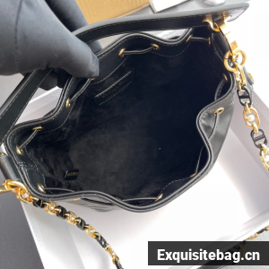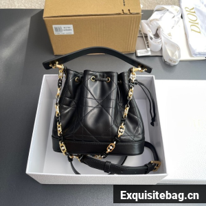 New for Fall 2024, the Dior Jolie bucket bag is a modern creation. Constructed in black calfskin and lambskin with Macrocannage stitching, it has a drawstring closure and spacious interior. Featuring a removable black leather top handle and adjustable, removable CD link chain in gold-finish metal accented by resin pearls, the small contemporary bag can be carried by hand, worn over the shoulder or crossbody.