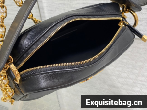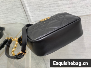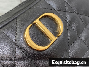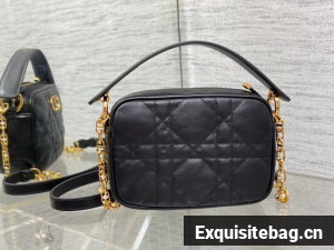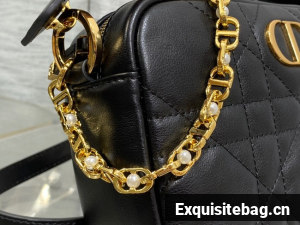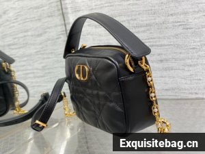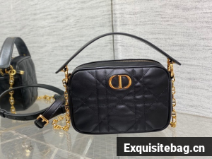 New for the Summer 2024 season, the Dior Caro Top Handle Camera bag is a sophisticated and practical design. Crafted in black calfskin, the small model is elevated by the originality of the Macrocannage stitching"s quilted effect. The bag features a zip closure and an antique gold-tone metal CD signature. The detachable top handle with Christian Dior Paris signature is completed by the removable chain shoulder strap with CD signature links, allowing it to be carried by hand, on the shoulder, or crossbody, for both day and evening wear.