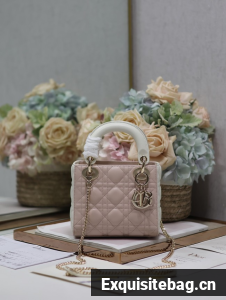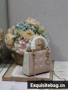 The Lady Dior bag embodies Dior"s vision of elegance and beauty. Sleek and refined, the timeless and modern style is crafted in two-tone latte and powder pink lambskin with Cannage stitching, creating the instantly recognizable quilted texture. Pale gold-finish metal D.I.O.R. charms further embellish and illuminate its silhouette. Featuring a removable chain shoulder strap, the miniature Lady Dior bag can be carried by hand, worn over the shoulder or crossbody as an ideal evening wear companion.