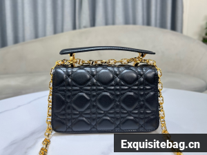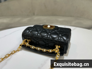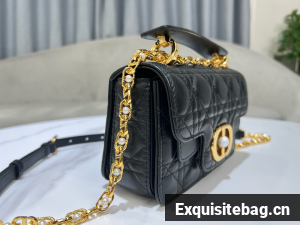 New for Summer 2024, the Dior Jolie Top Handle bag presents an elegant and functional design. It is crafted in black calfskin with Cannage stitching and features a double flap enhanced by a CD signature embellished with a white resin pearl, as well as three compartments and a zip pocket to accommodate all the essentials, day or evening. The removable top handle is completed by a detachable chain strap with a leather insert and CD signature links embellished with white resin pearls, allowing the miniature bag to be comfortably carried by hand, worn over the shoulder or crossbody.
