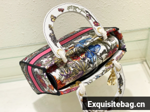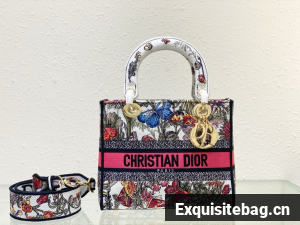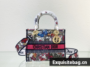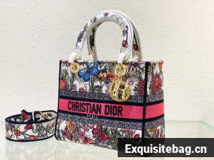 The Lady D-Lite bag combines classic elegance with House modernity. The style is fully embroidered with a white multicolor Mexico Millefiori motif by Pietro Ruffo, showcasing butterflies and Mexican flowers in an elegant and colorful spirit. A Christian Dior Paris signature adorns the front, while D.I.O.R. charms in pale gold-finish metal further enhance and highlight the silhouette. Featuring a wide, removable embroidered shoulder strap, the medium Lady D-Lite bag can be carried by hand or worn crossbody.