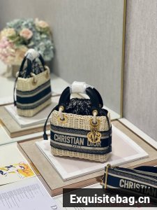 The Lady Dior bag epitomizes Dior"s vision of elegance and beauty. Sleek and refined, the timeless style exemplifies the House savoir-faire with hand-woven natural wicker. Featuring leather handles and an interior drawstring pouch in blue Dior Oblique jacquard, the design is enhanced by an embroidered Christian Dior signature band, inspired by the Dior Book Tote. A wide, removable embroidered shoulder strap allows the miniature bag to be carried in the hand, over the shoulder or crossbody.