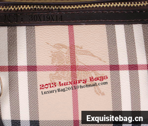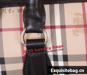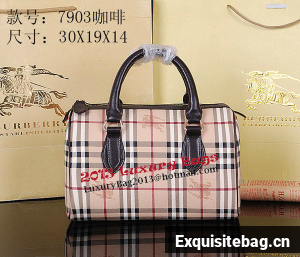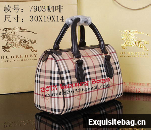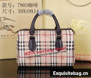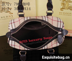 Burberry Medium Haymarket Check Bowling Bag 7903 Brown - Coated canvas bowling bag in Haymarket check with leather trim- Top zip closure, - rolled leather handles with polished metallic D-ring attachments Size: W30 x H19 x D14 cm(1" = 2.54cm) Replica Burberry Bags comes with:serial numbers, care booklet, Burberry dust bag, Burberry Card, tag.
