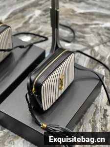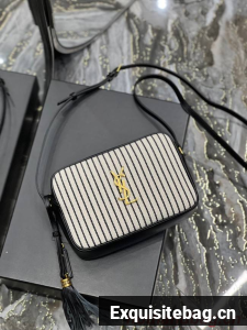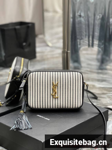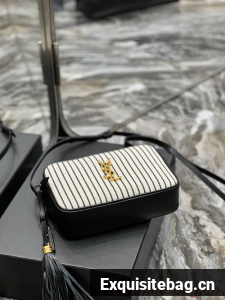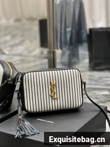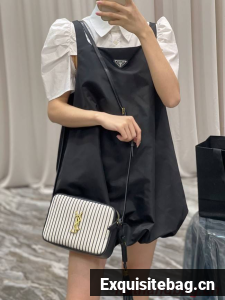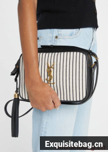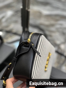 SAINT LAURENT MONOGRAM SHOULDER BAG MADE WITH RECYCLED COTTON AND ORGANIC COTTON LINING, FEATURING AN ADJUSTABLE LEATHER STRAP, REMOVABLE LEATHER TASSEL, ICONIC METAL YSL SIGNATURE AT THE CENTER AND A STRIPED PATTERN.
