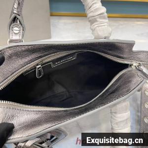 Neo Cagole XS Handbag in dark grey Arena lambskin, aged-silver hardwareDimensions : L10,2 x H7 x W4,5 inch• Arena lambskin• Trapezoidal shape• Two leather hand-braided handles • Adjustable and removable strap (19,6 inch)• Aged-silver hardware • Zipped closure with knotted leather puller • Front zipped pocket with knotted leather puller • 1 inner zipped pocket • 1 removable zipped pouch• 1 removable heart mirror• Tone-on-tone Balenciaga logo embossed on mirror• Cotton canvas lining• Made in Italy• Wipe with a soft clothMaterial: 100% lambskinProduct ID: 700940210B05812Replica Balenciaga Comes with serial numbers, authenticity card, dust bag and care booklet.