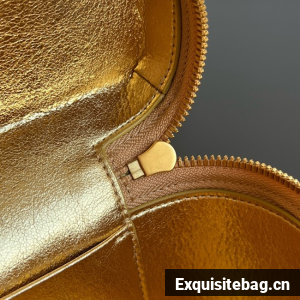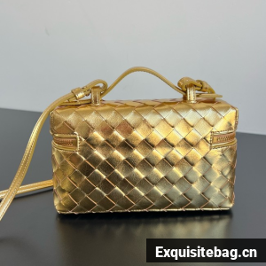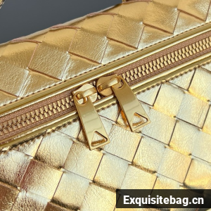 • Intrecciato wood-embossed lamina leather vanity case with detachable strap• One main compartment, one flat pocket• Zipped closure• Lining: Lambskin• Color: Gold• Hardware: Gold finish• Made in: Italy• Product code: 789109V5XQ08472ChatGPT said: • Height: 12.5 cm (4.9") • Width: 22 cm (8.7") • Depth: 5 cm (2") • Handle drop: 4.5 cm (1.8") • Strap drop: 55 cm (21.7")Replica Bottega Veneta Comes with dust bag, authentication cards, and pamphlets.