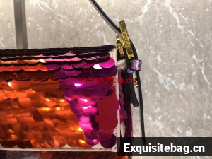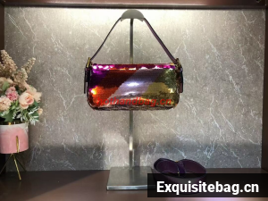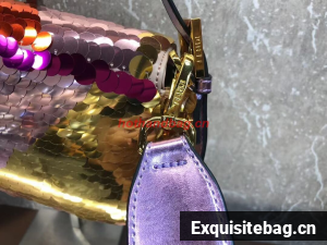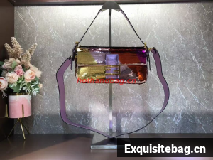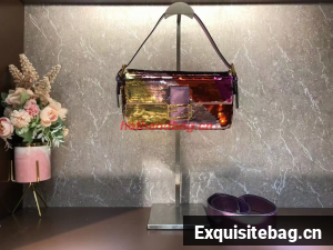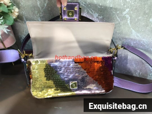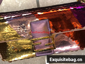 Iconic medium Baguette bag embroidered all-over with metallized sequins in different shapes and sizes. Decorated with an FF clasp.