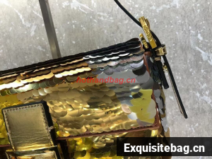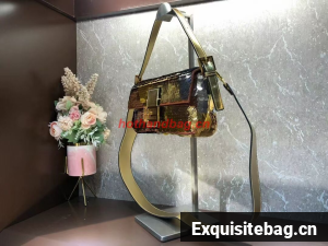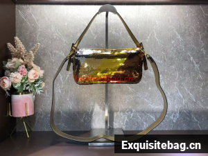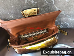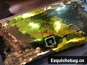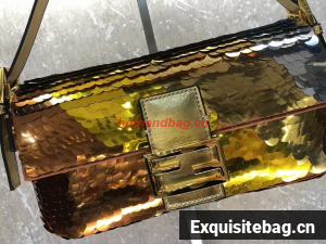 Iconic medium Baguette bag embroidered all-over with metallized sequins in different shapes and sizes. Decorated with an FF clasp.