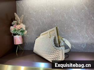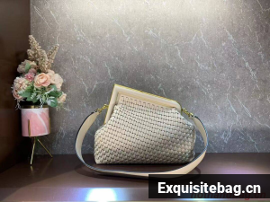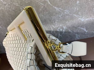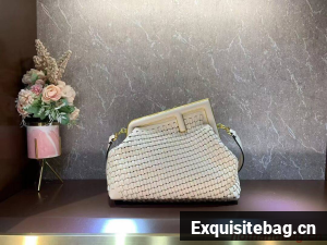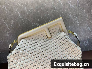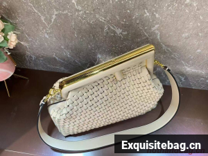 Fendi First bag made of finely braided leather, with oversized metal F clasp bound in tone on tone nappa leather.