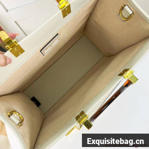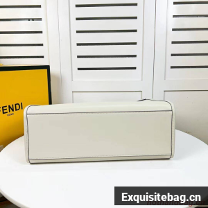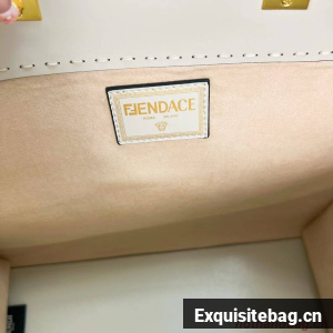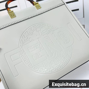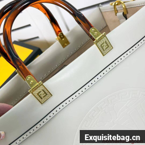 Medium Sunshine shopper made of leather with a laminated print with the Fendace logo, a symbol of the collection born of the creative collaboration between Fendi and Versace. Black plexiglass stiff handles.