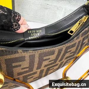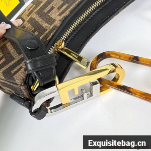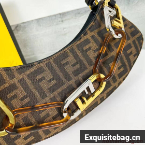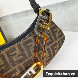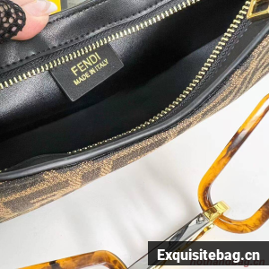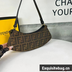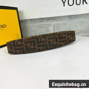 Pouch made of chenille with brown FF tapestry motif and zipper closure, decorated with Fendi Roma lettering in gold-colored metal.