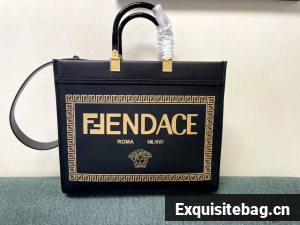 Medium Sunshine shopper made of black leather with a laminated print with the Fendace logo, a symbol of the collection born of the creative collaboration between Fendi and Versace. Black plexiglass stiff handles.