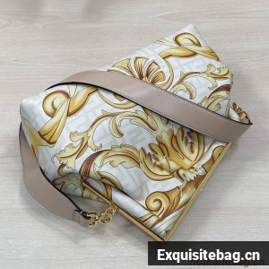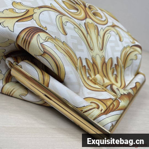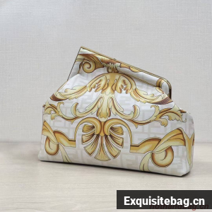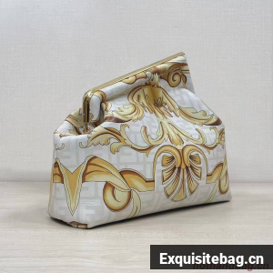 Medium Fendi First bag made of white silk with Versace by Fendi print. Born of the creative collaboration between the two fashion houses, the graphics combine the iconic Fendi FF logo with the Versace gold Baroque print. Oversized metal F clasp bound in tone on tone silk.