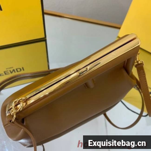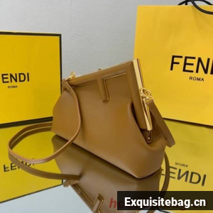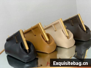Small Fendi First bag made of soft, nappa leather with oversized metal F clasp wrapped in tone on tone nappa leather.