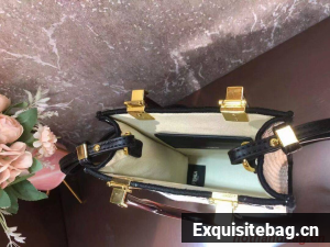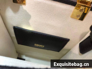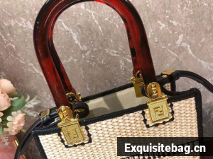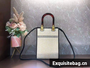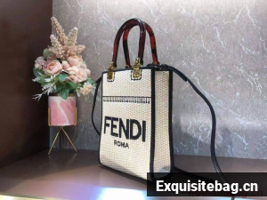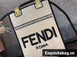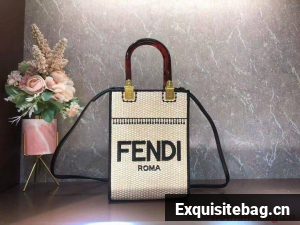 Mini Sunshine Shopper bag made of natural colored straw with FENDI ROMA embroidery and stiff black patent leather handles.