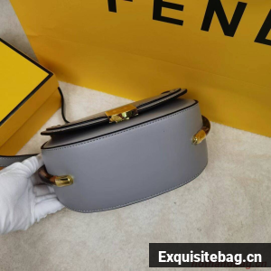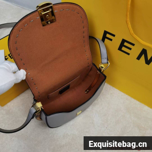 Hand-stitched grey leather satchel featuring a metallic closure with the iconic FF motif and hot-pressed Fendi Roma logo under the flap. With a lined, internal compartment, small inner pocket, tortoiseshell-effect plexiglass details and gold-finish metalware.