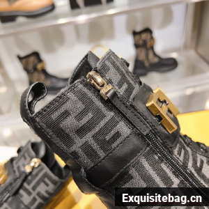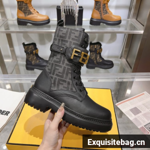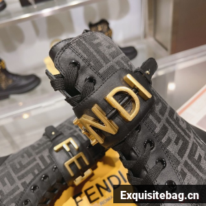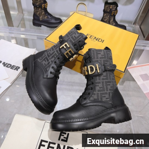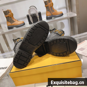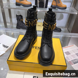 Round toe combat boots closed with laces and Fendi lettering strap. Made of black leather. Finished with jacquard FF fabric. Gold-finish metalware.