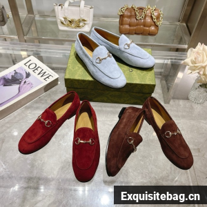 The Gucci Jordaan is an evolution of the classic loafer with Horsebit. The pair of shoes highlights the emblematic gold-tone equestrian hardware through a slimmer silhouette. Here, the style is presented suede.